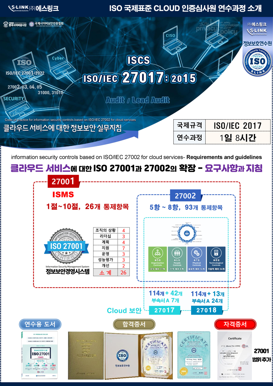 ISO/IEC 27017:2015는 클라우드 서비스의 제공 및 사용에 적용 가능한 정보보안 통제 지침을 제공합니다. 2015년 12월 제정되었습니다. ISO SC27 연구반에서 개정을 위한 DIS로 진행중에 있습니다.(현재 2025.8.1) ISO/IEC 27001:2022(또는:2013) 연수과정 이수자는 클라우드 서비스 보안 영역에 대하여 기존 27001 인증심사원 자격증에 범위를 추가 하실수 있습니다. 연수과정을 수료하고 합격증서를 취득한 이후 국제 인증심사원 자격등록기관(PCAA) 에 범위 확장을 요청하면 자격증서가 업그레이드 됩니다.