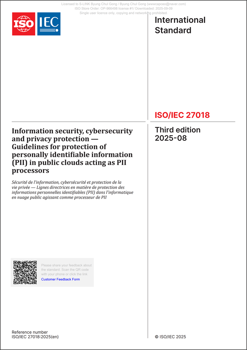 ISO/IEC 27018:2019는 ISO/IEC 29100의 개인정보보호 원칙에 따라 공공 클라우드 컴퓨팅 환경에서 개인식별정보(PII)를 보호하기 위한 조치를 구현하기 위한 일반적으로 수용되는 통제 목표, 통제 조치 및 지침을 수립합니다. 2025년 8월 3차 개정되었으며, 2019년 2판은 취소 되었습니다.