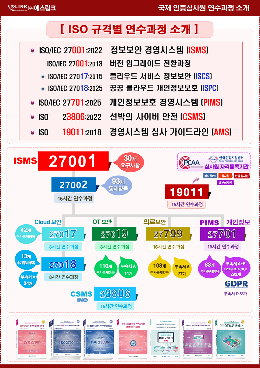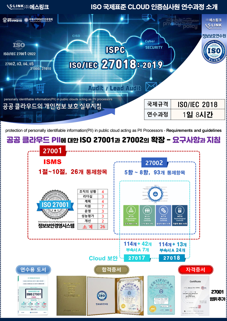 ISO/IEC 27001:2022(또는:2013) 연수과정 이수자는 개인정보 수탁자 역할을 하는 공공 클라우드의 개인정보 보호 실무지침 영역에 대하여 기존 27001 인증심사원 자격증에 범위를 추가 하실수 있습니다.