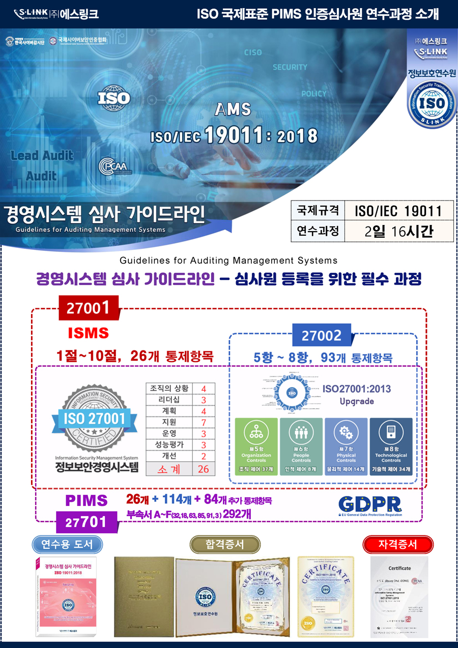 ISO/IEC 27001, 27701, 23806, 23806 등 규격 연수를 이수하고 평가시험에 합격한 자