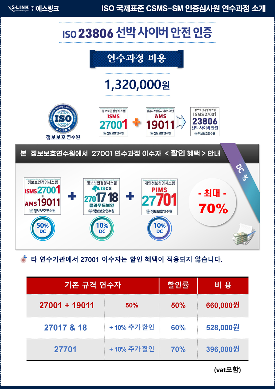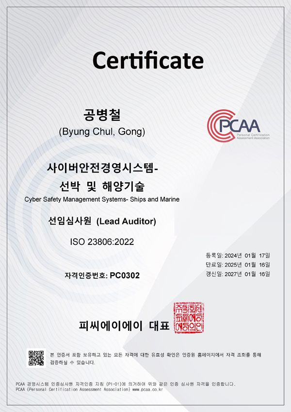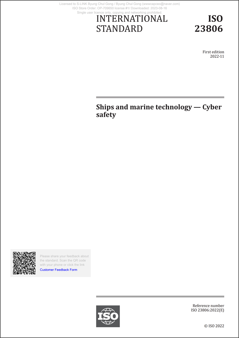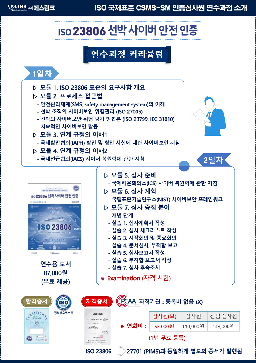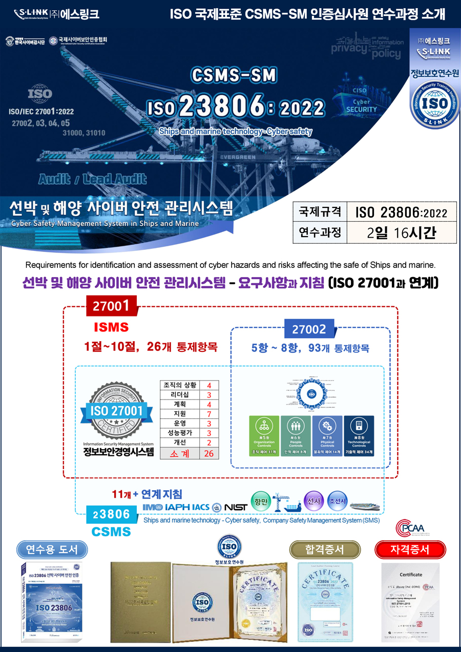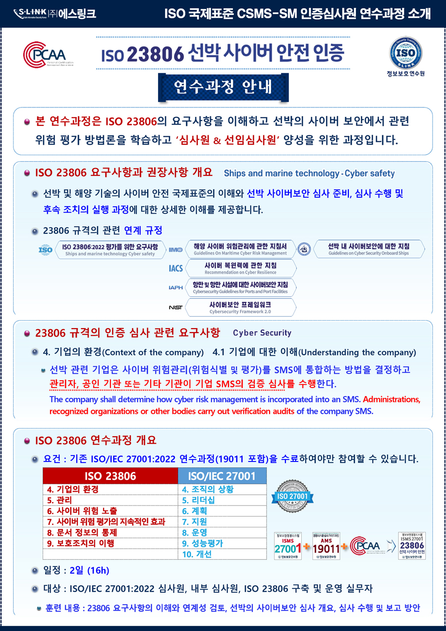 * ISO 23806:2022 선박 사이버 안전 연수과정 개요(CSMS-SM 국제인증심사원)