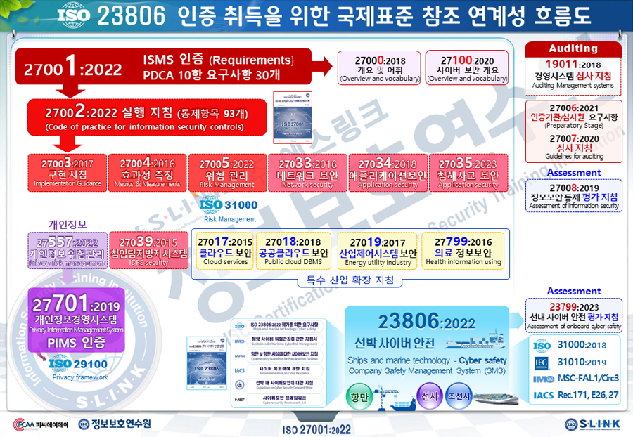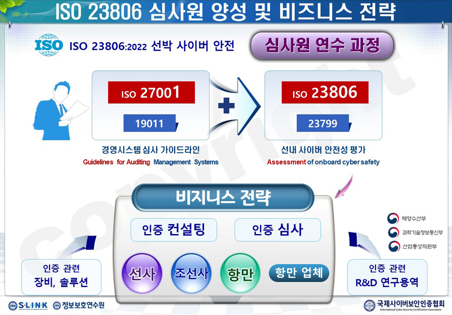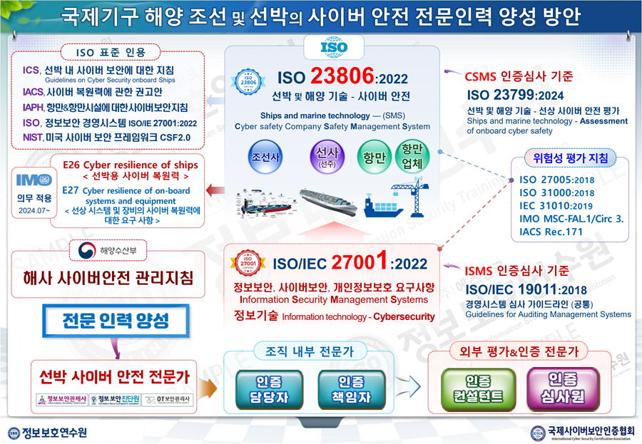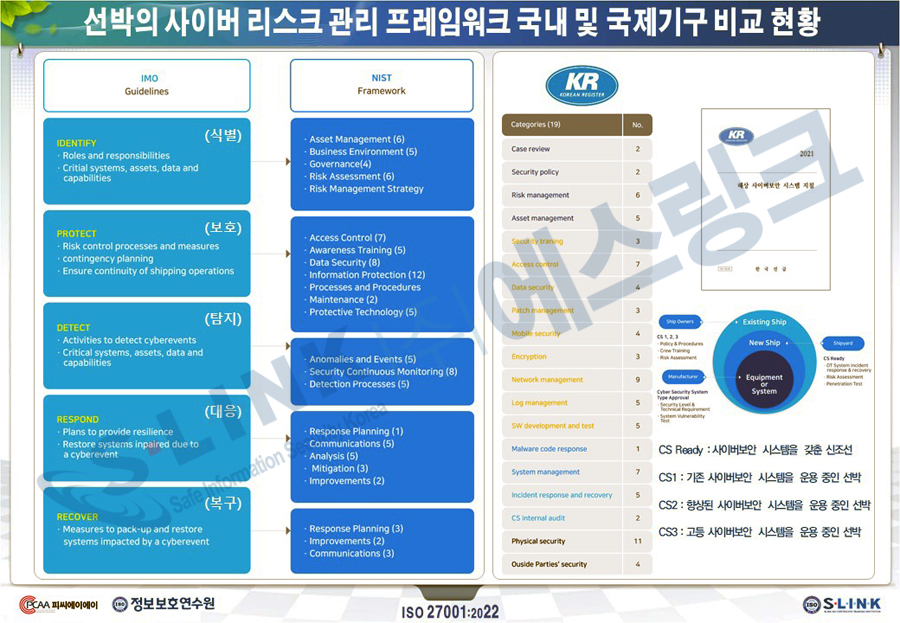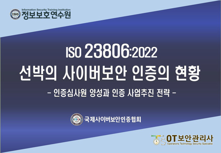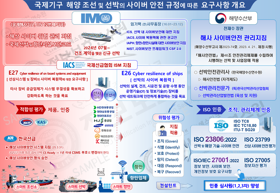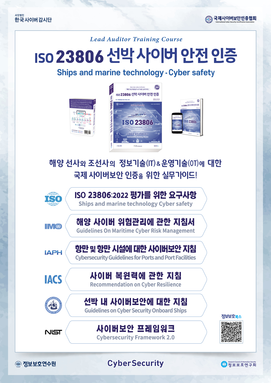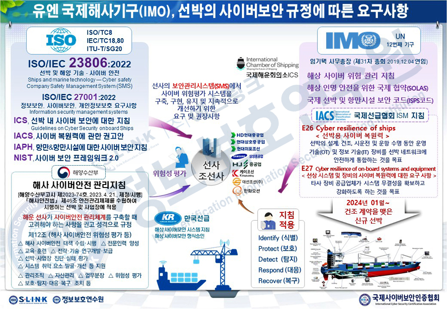- 국제선급협회(IACS ; International Association of classification Society)는 2020년 7월 선박의 인도시 사이버 복원력이 서비스 수명 동안 지속적으로 유지할 수 있는 기술 정보를 제공하는 IACS Rec No.166 '해상 사이버 위험관리 지침(Guidelines on Maritime Cyber Risk Management)'를 개발하고 2022년 4월 개정하였습니다. 또한, 안전관리시스템에 사이버 위험관리(Maritime Cyber Risk Management in Safety Management Systems)을 통합하여 사이버 공격으로부터 보호ㆍ관리하는 프로세스를 통하여 선박의 사이버 복원력에 대한 최소한의 요구사항 UR E26(Cyber resilience of ships)과 E27(Cyber resilience of on-board systems and equipment)을 2022년 4월 배포하였습니다. 이 지침은 2024년 1월 이후에 건조 계약을 체결한 신조선부터 적용됩니다.