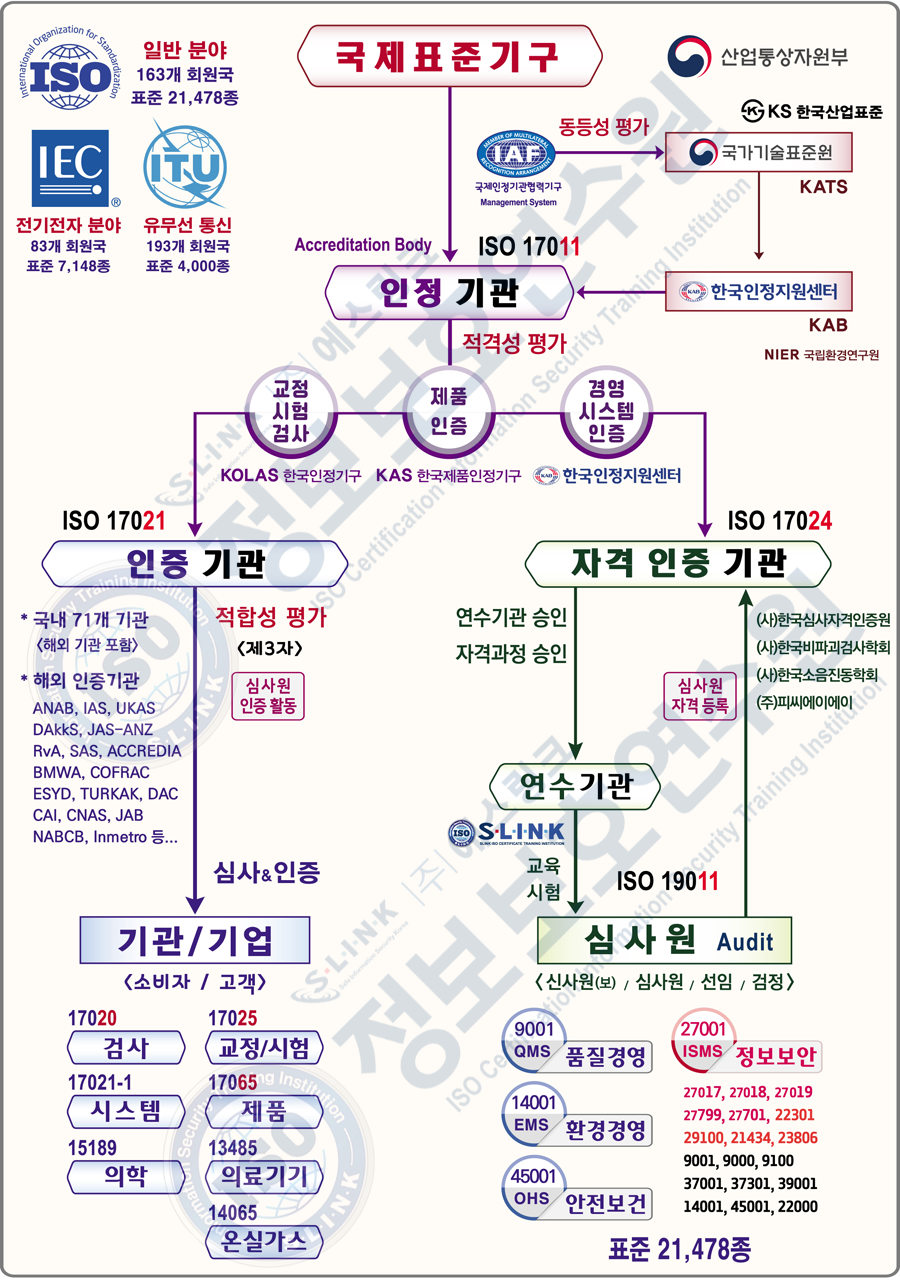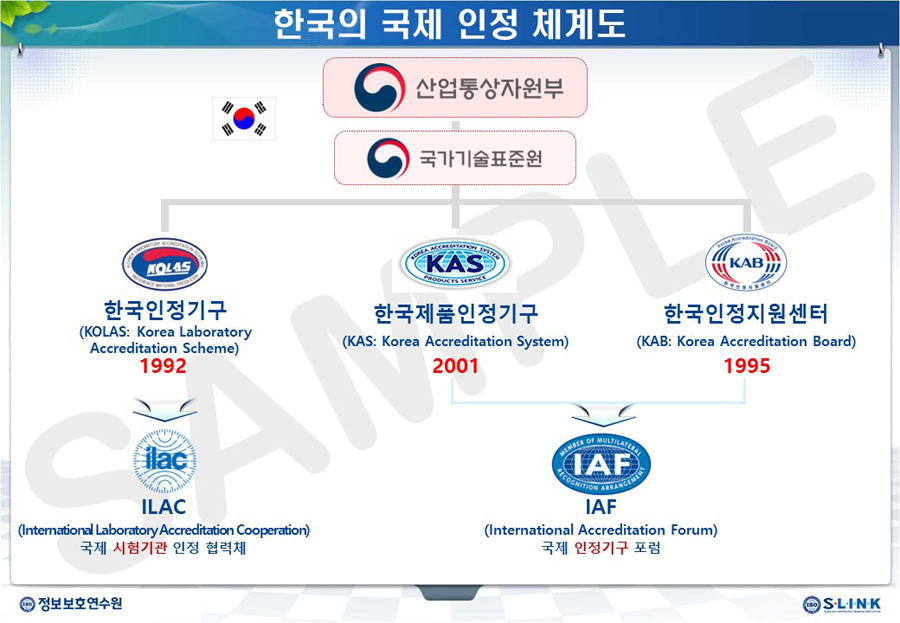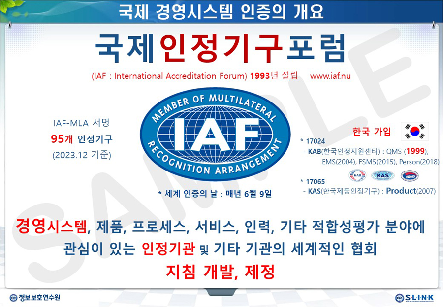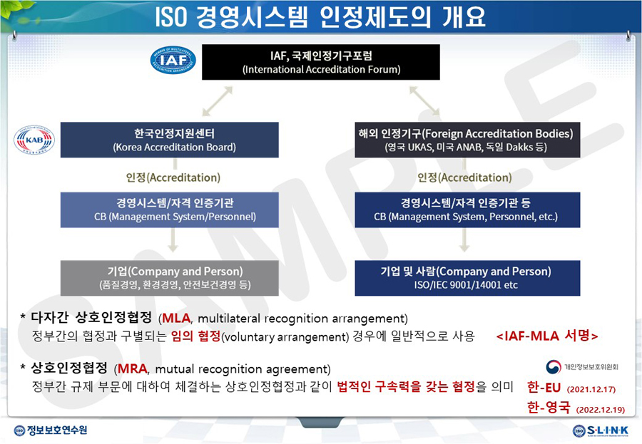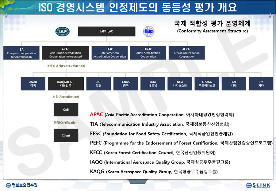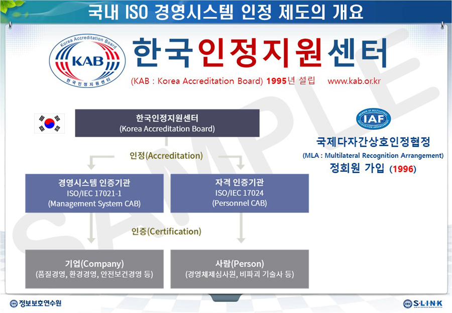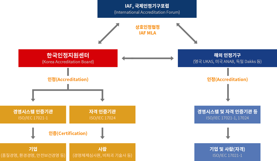 * KAB은 국제다자간상호인정협정(MLA : Multilateral Recognition Arrangement)에 품질경영시스템(ISO 9001) 1999년에 환경경영시스템(ISO 14001) 2003년에 협정 가입함으로써 인증서가 상호 통용될 수 있는 기반을 구성하였습니다. - 산업 부문별 품질경영시스템과 기타 전문경영시스템의 시장의 요구에 따라 산업통상자원부의 지원 아래 환경경영시스템, 녹색경영시스템, 식품안전경영시스템, 정보보안경영시스템, TL 9000, ISO 45001, ISMS, FSSC 22000, 반부패, 비즈니스연속성 및 항공우주 품질경영시스템 등에 대한 인정 업무를 관장하고 있습니다.